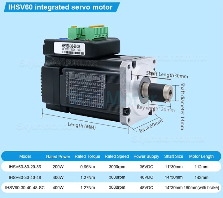 El servomotor de CA integrado iHSV60-30-20-36 es un servoaccionamiento de CA integrado en el servomotor, adopta control vectorial en chip DSP, se caracteriza por bajo costo, circuito cerrado completo, totalmente digital, bajo calor, pequeña vibración y alta respuesta, así como incluye tres modos de control de bucle de retroalimentación ajustables (bucle de posición, bucle de velocidad y bucle de corriente).